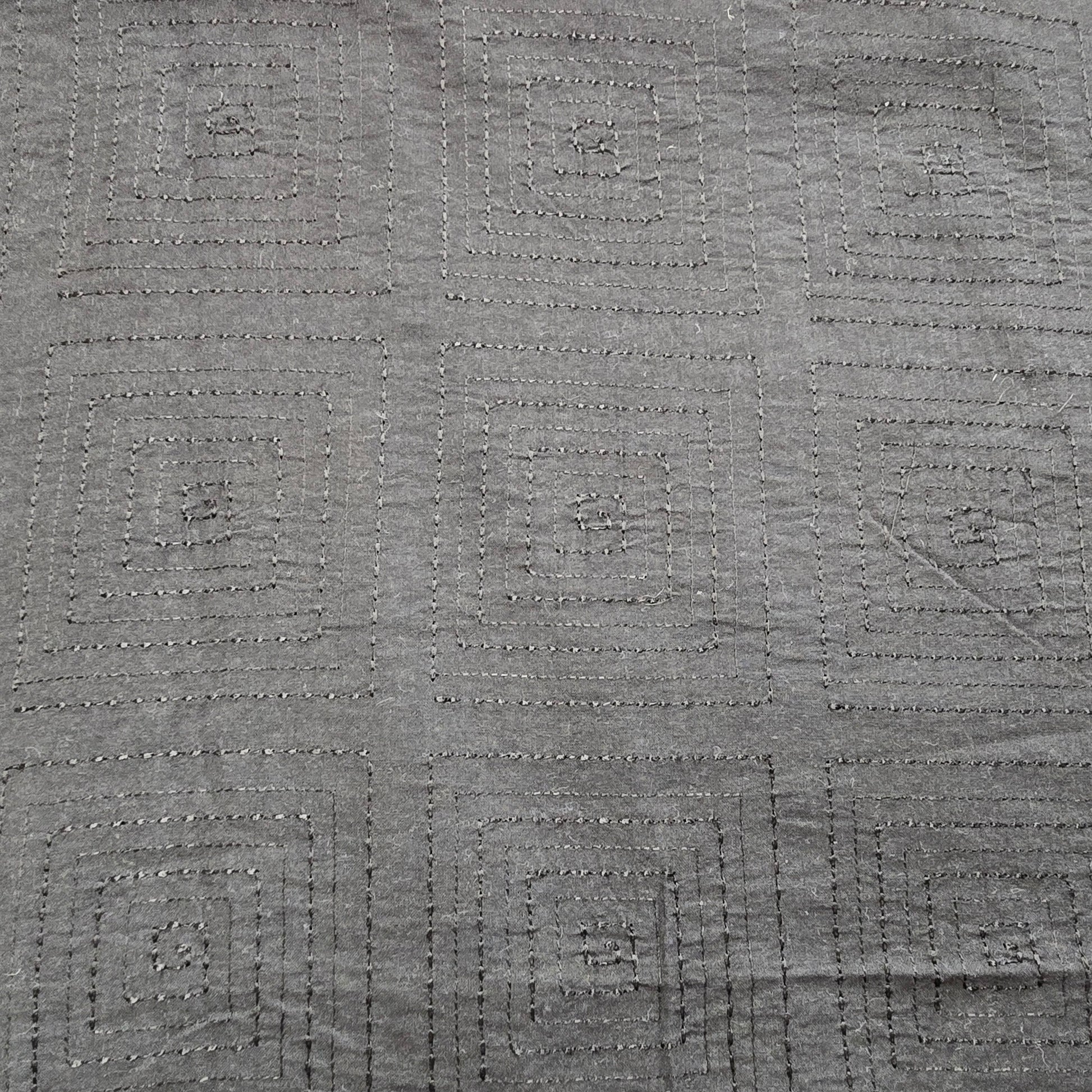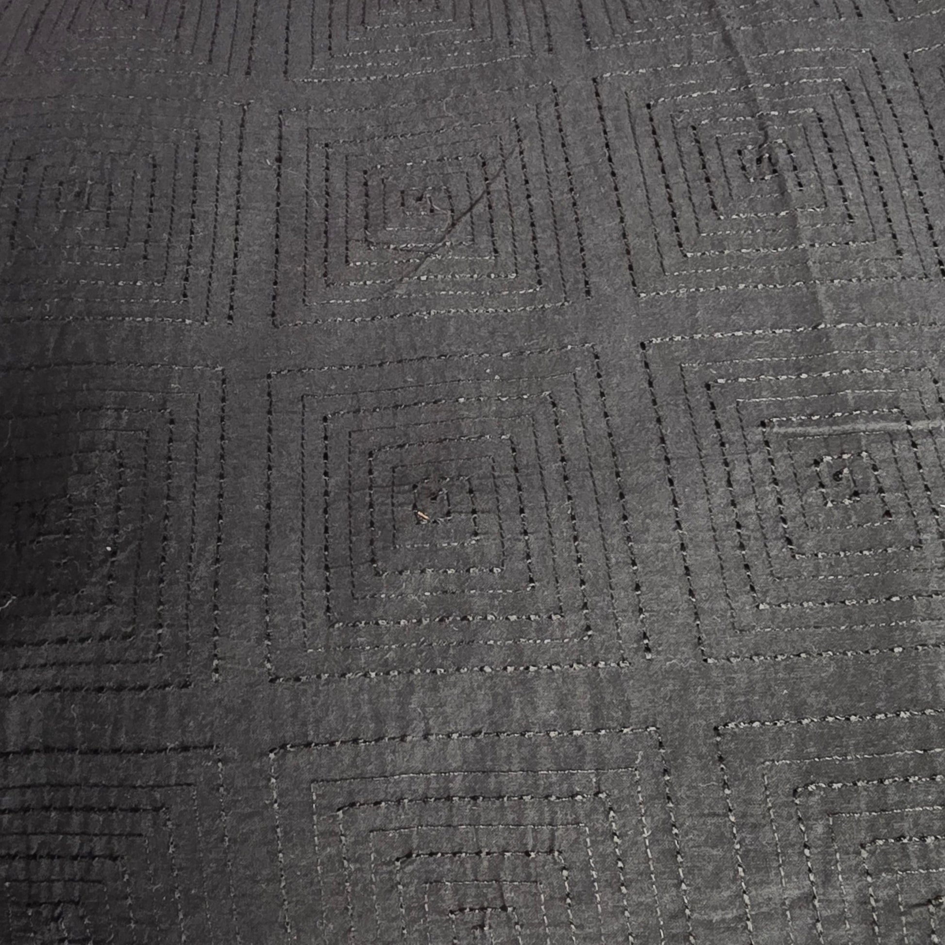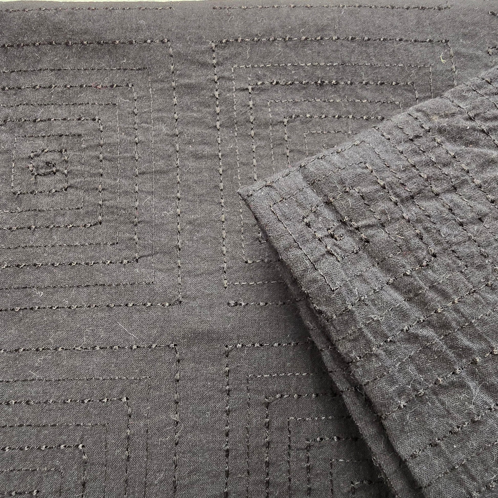 Beautiful woven cotton voile fabric embroidered in a swirl square design in a black embroidery thread on a black base.