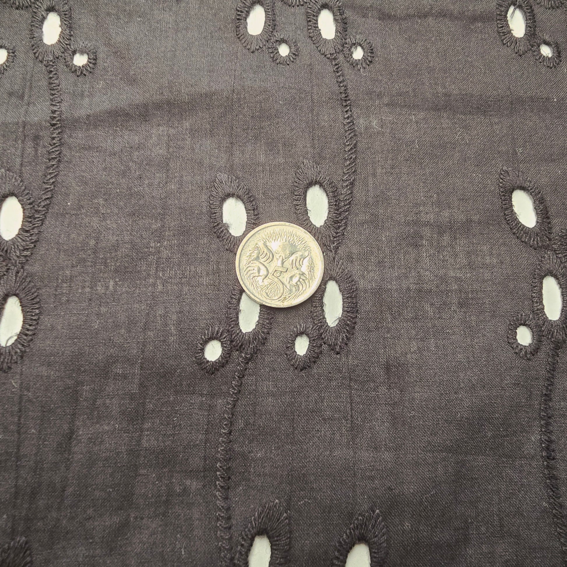 This black broderie anglaise fabric features delicate, intricate embroidery woven into a soft, breathable textile. Ideal for refined garments or elegant home decor, it offers a timeless, sophisticated look with exceptional craftsmanship. The fabric’s lightweight nature ensures comfort while adding a classic decorative touch to your projects.
