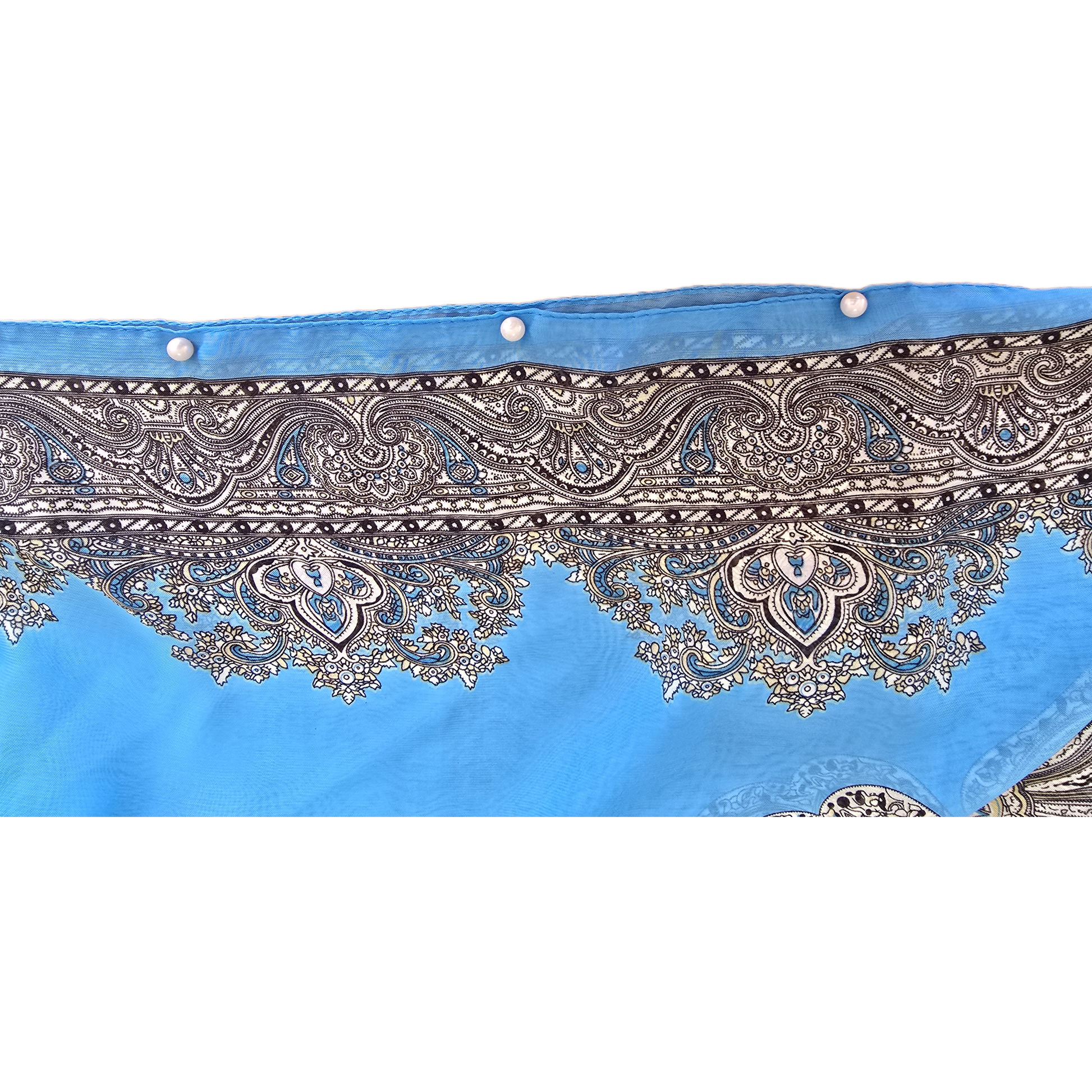 length - 150cm 100% polyester chiffon scarf. Featuring a decorative, dark grey/charcoal paisley border along the top neckline/shoulder and the bottom hem. The center of the scraf is a solid color. The shoulder is pinned together by 3 pearls. The shoulder width is 36cms.