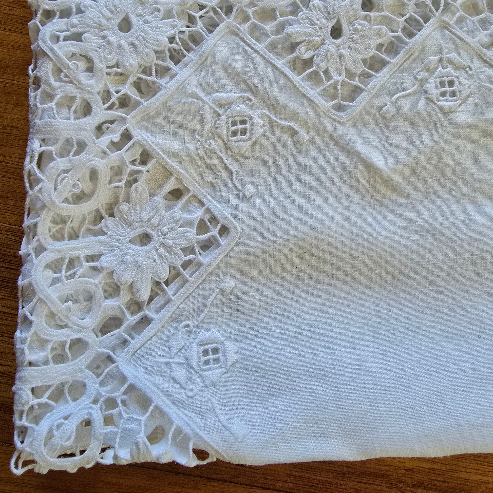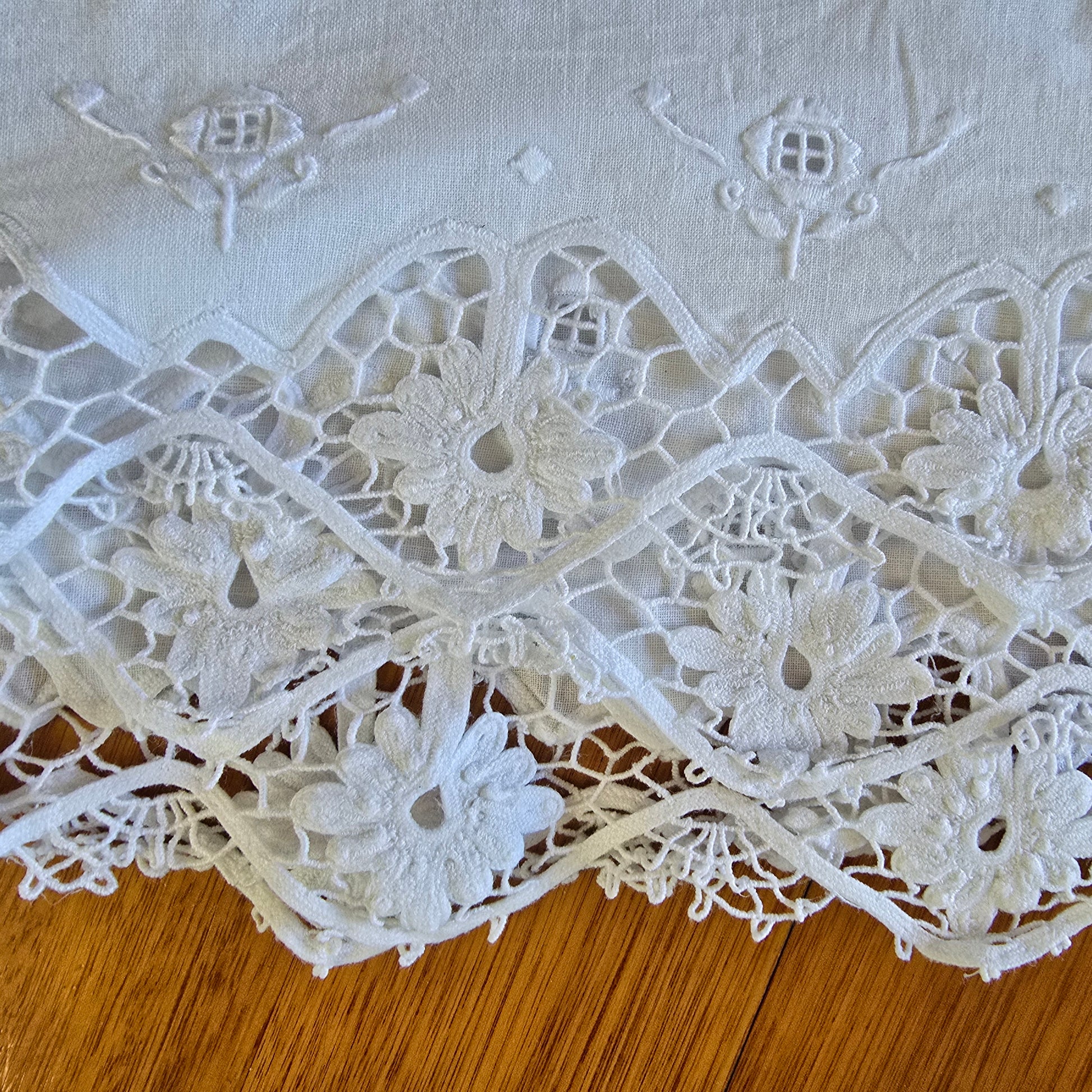 Antique/vintage white table cloth featuring intricate needlework, combining cutwork and richelieu embroidery. A beautiful example of traditional handiwork common in the early-to-mid 20th century.