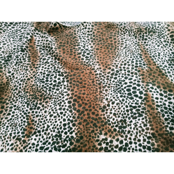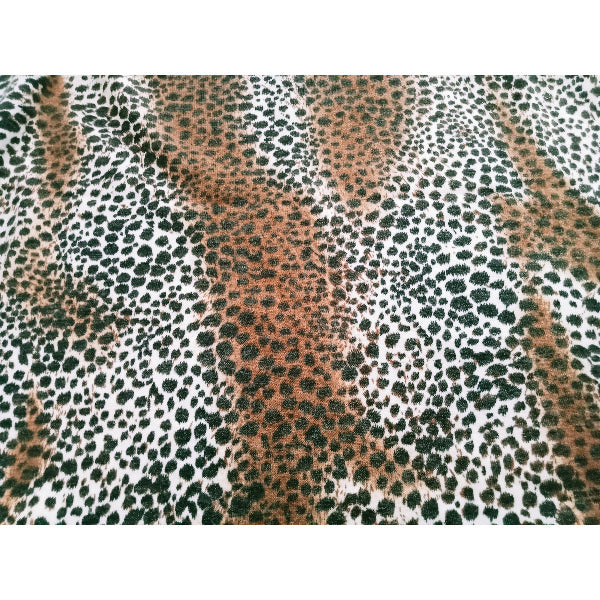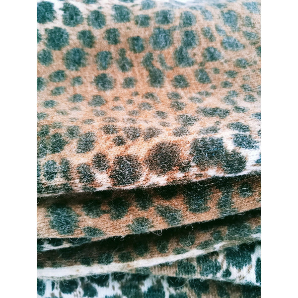 Gorgeous knit fabric printed with a leopard design in caramel, cream and charcoal, with a light mohair finish on the right side.