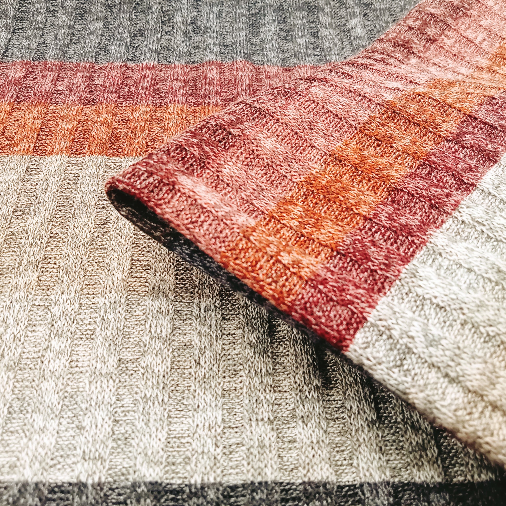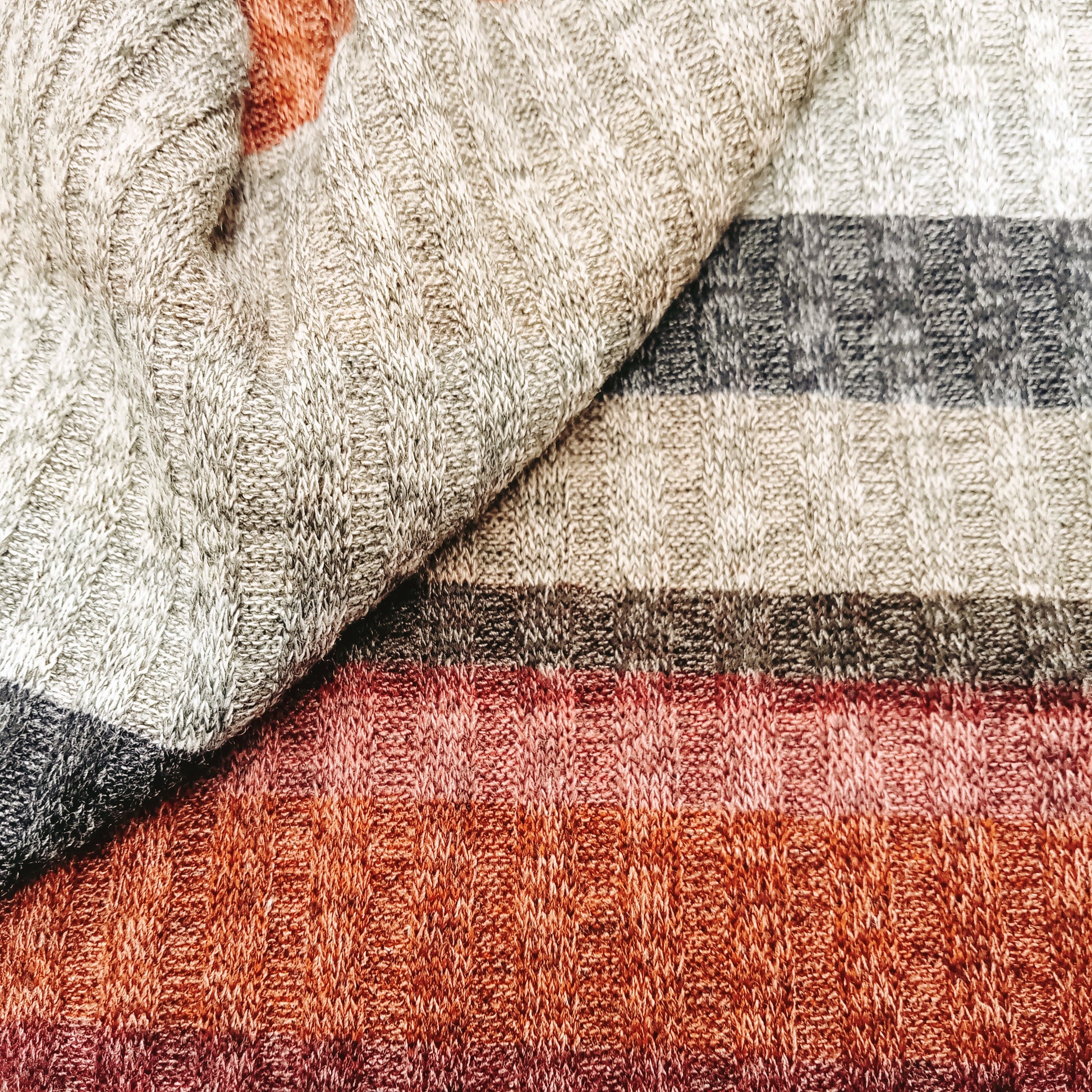medium weight marle ribbed knit. Knitted in a striped design in muted shades of plum, oatmeal, charcoal and burnt orange