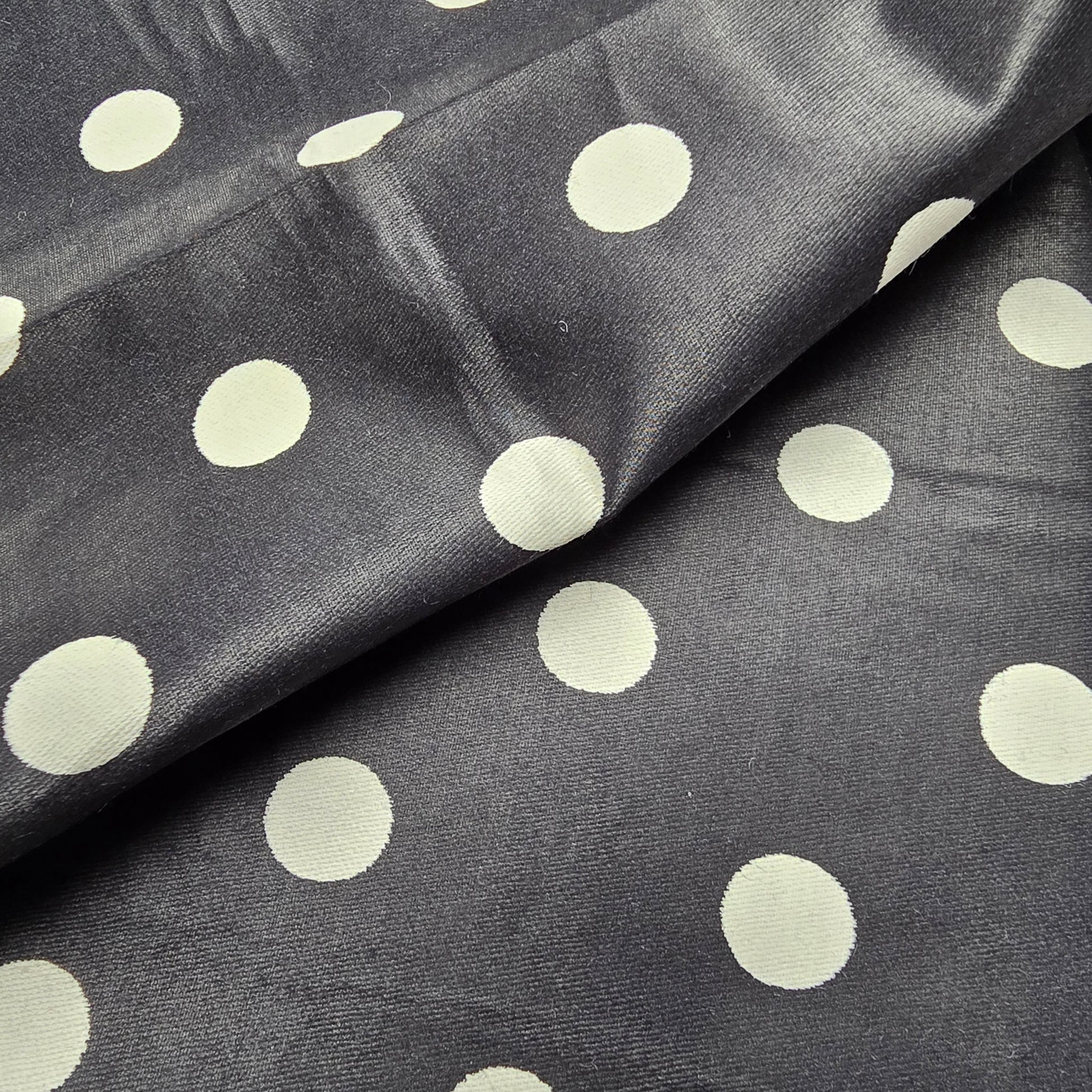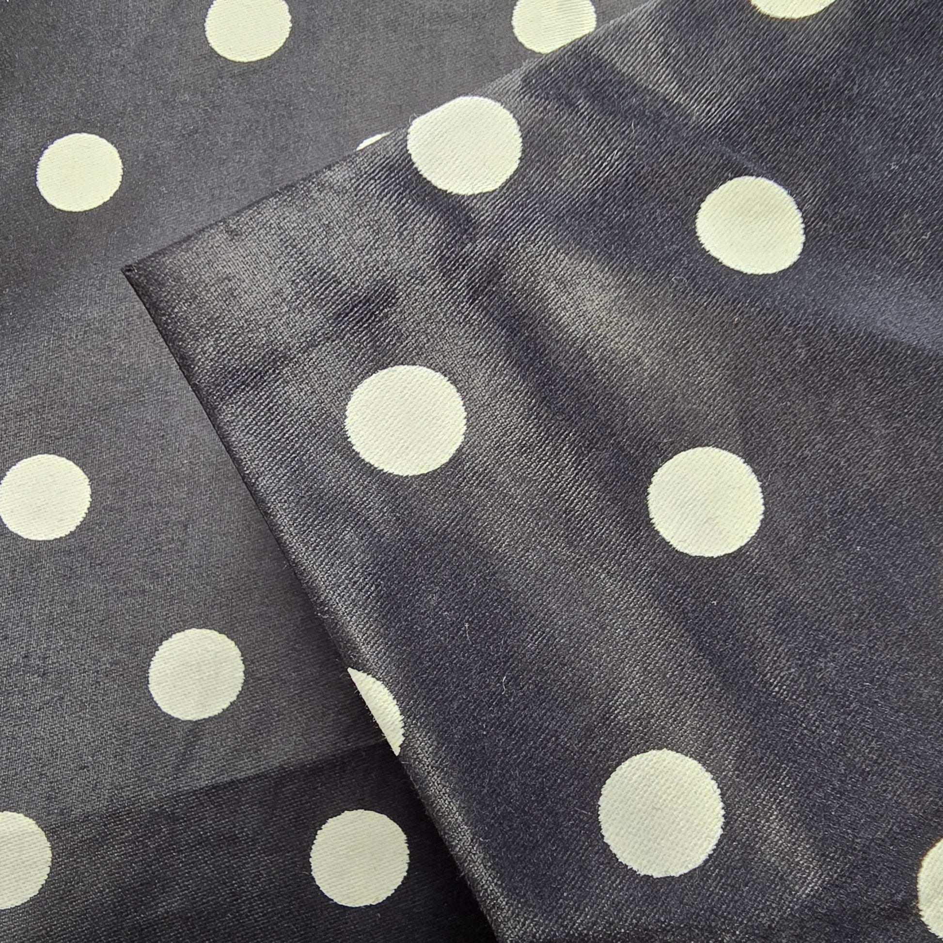Black Taffetta style woven fabric, printed with white polka dots approx 1cm wide.