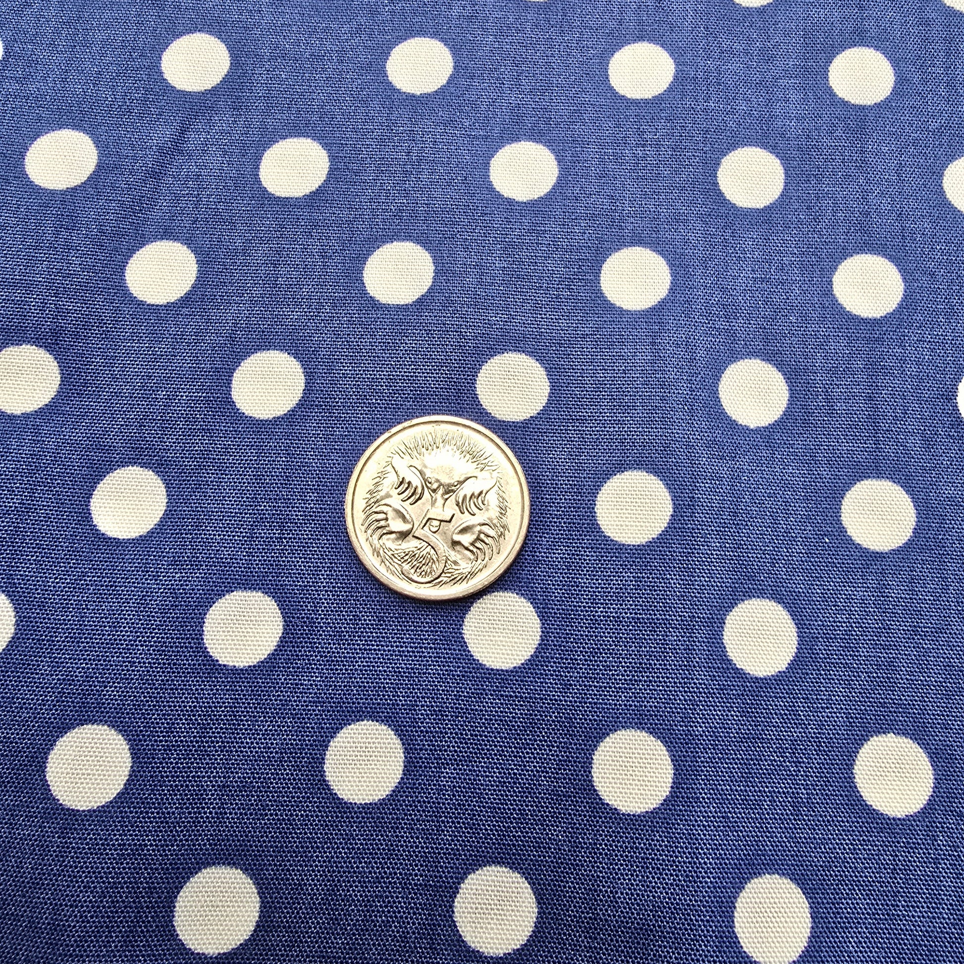 A flowy polka dot printed rayon in a denim blue shade base with white polka dots approx 0.5cm wide.