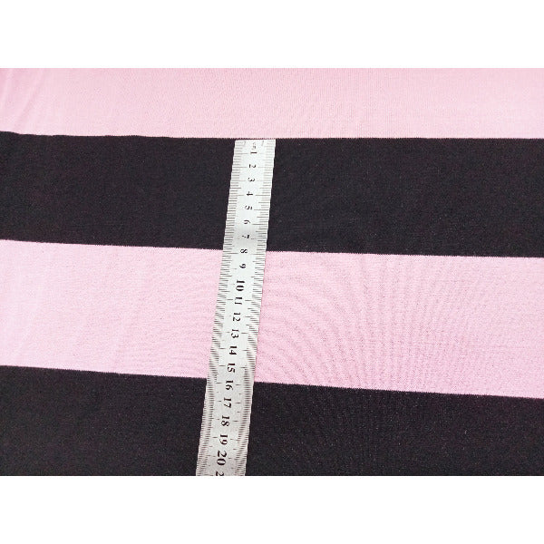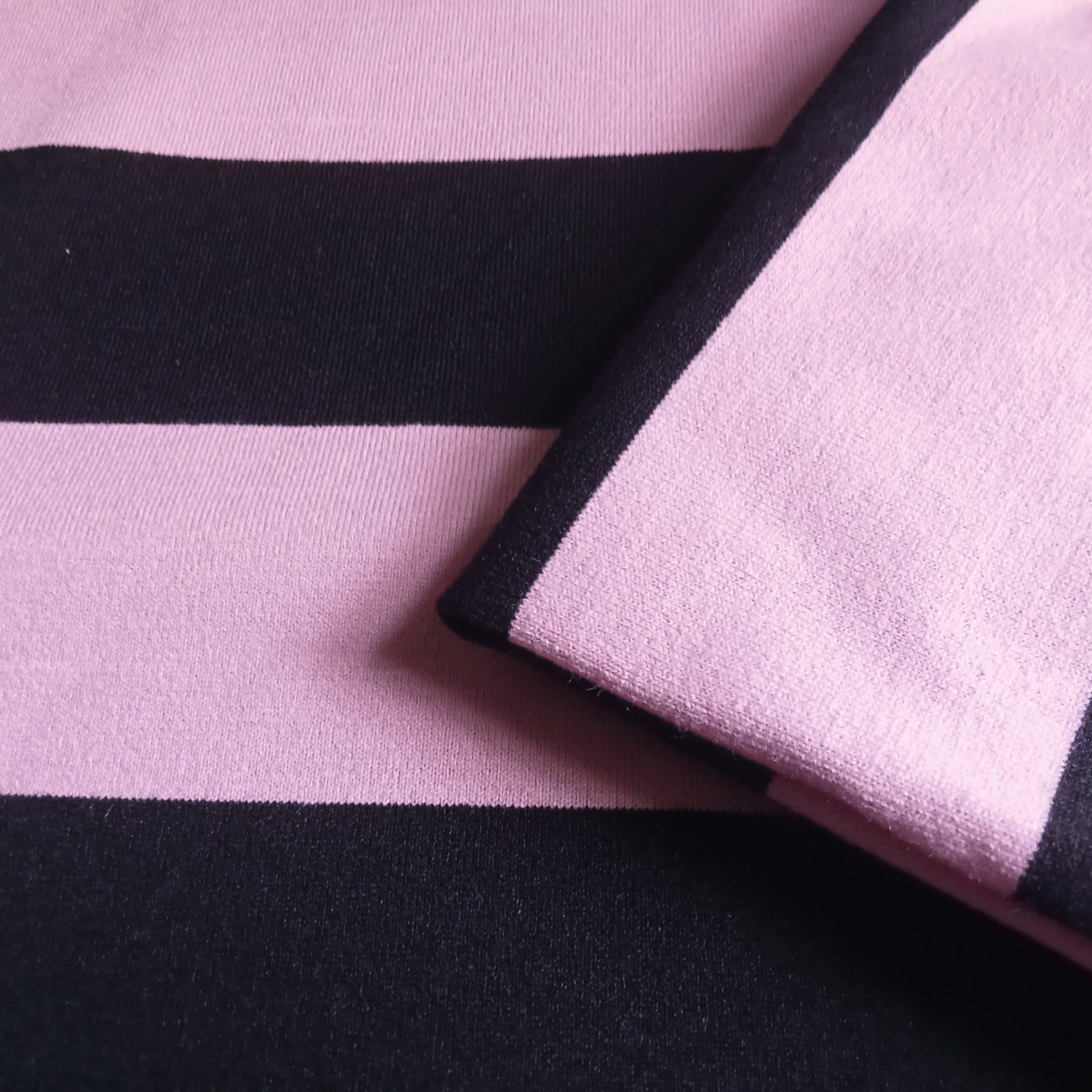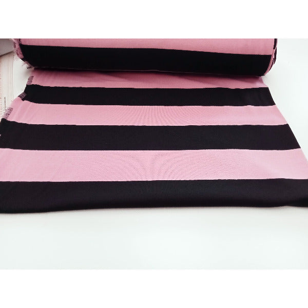 Stunning medium weight knit in pink and charcoal. The stripe runs vertically to the selvage and is approx. 5cm wide.