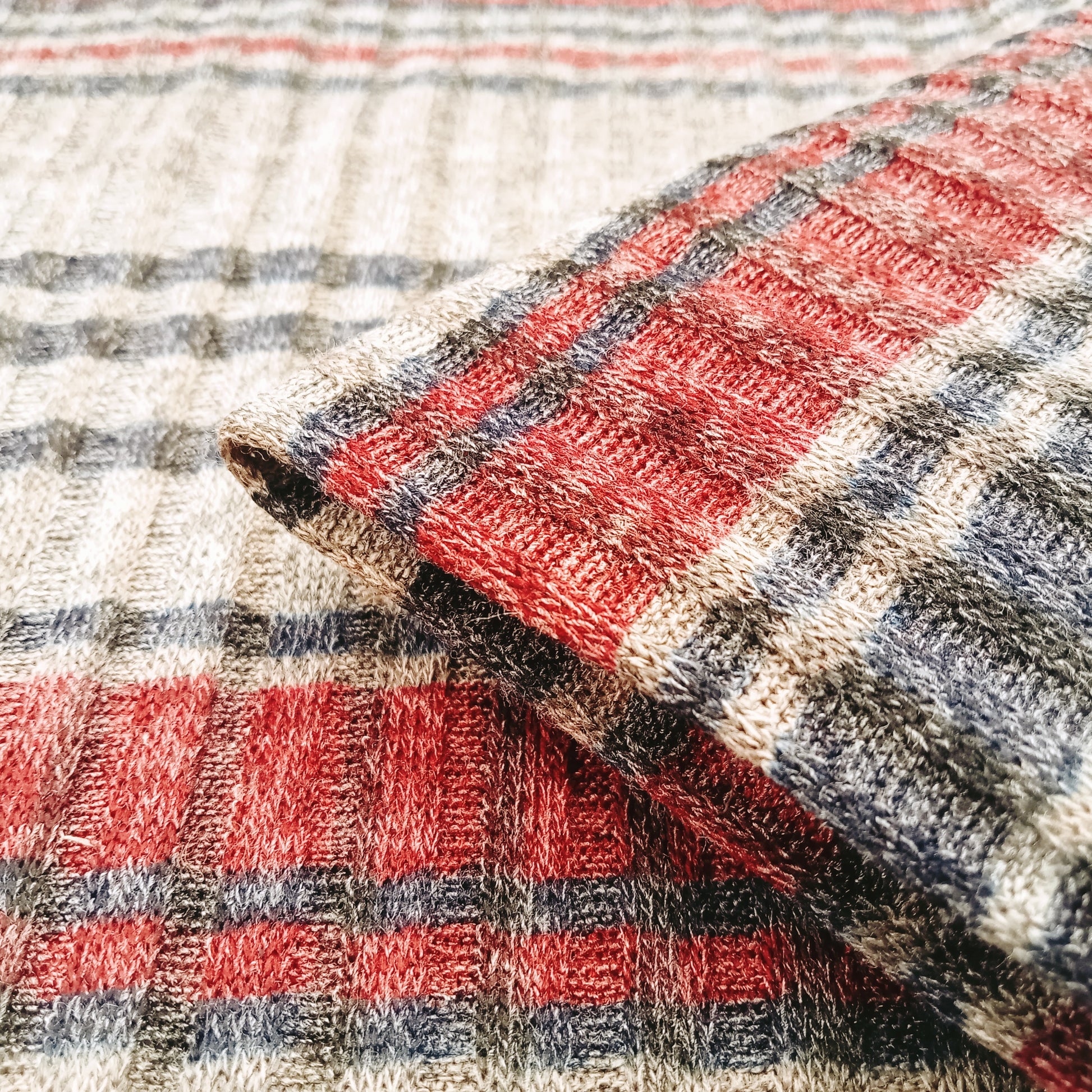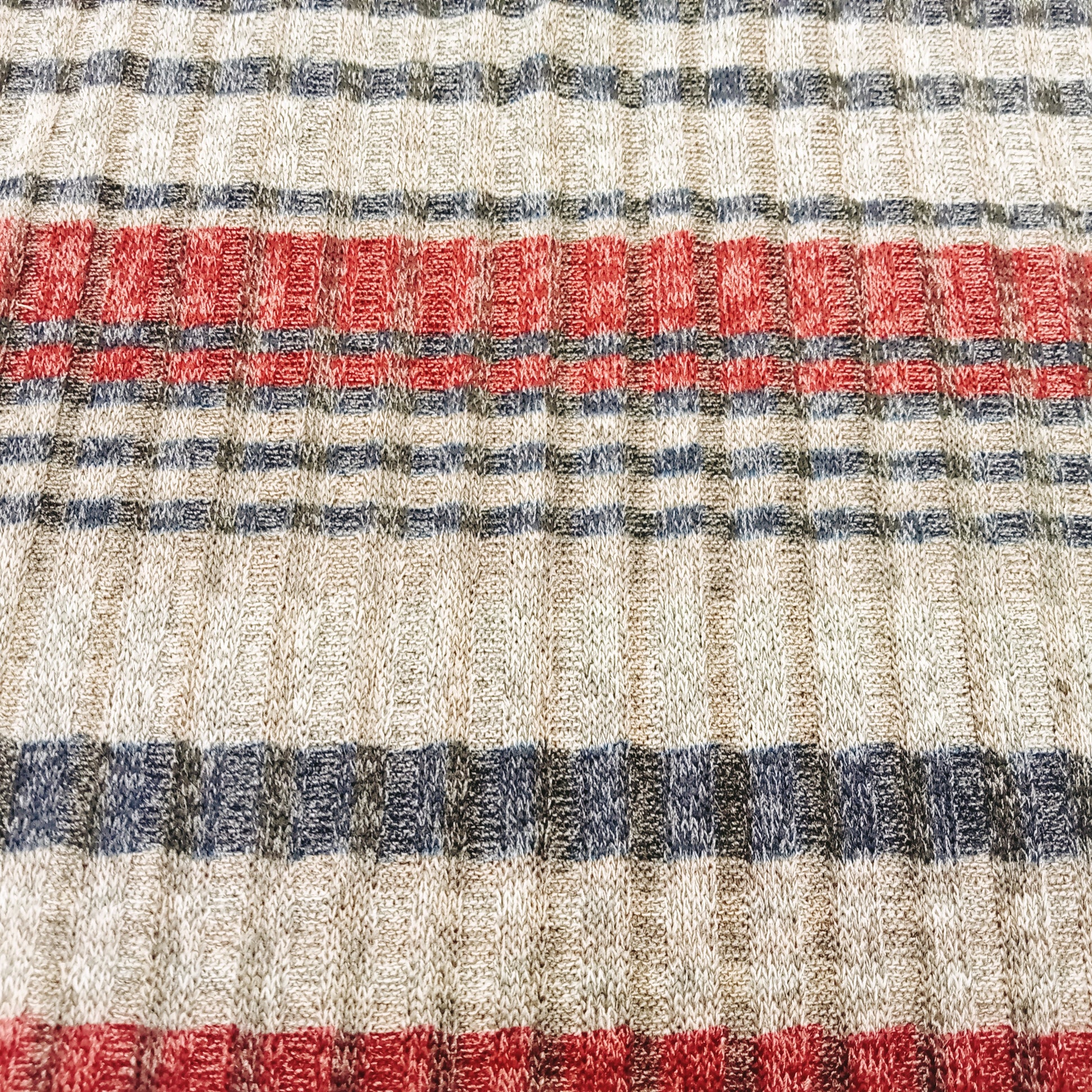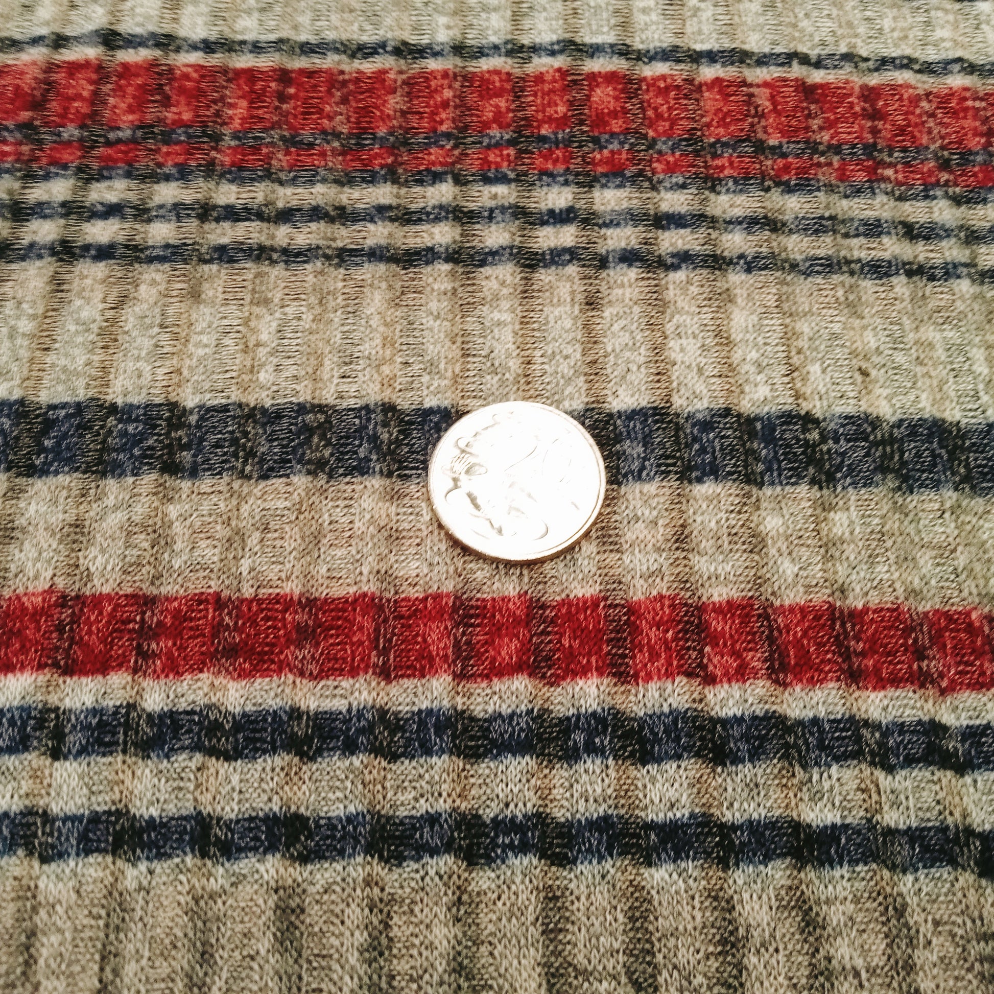 medium weight marle ribbed knit. Knitted in a striped design in muted shades of plum, grey, navy and taupe.