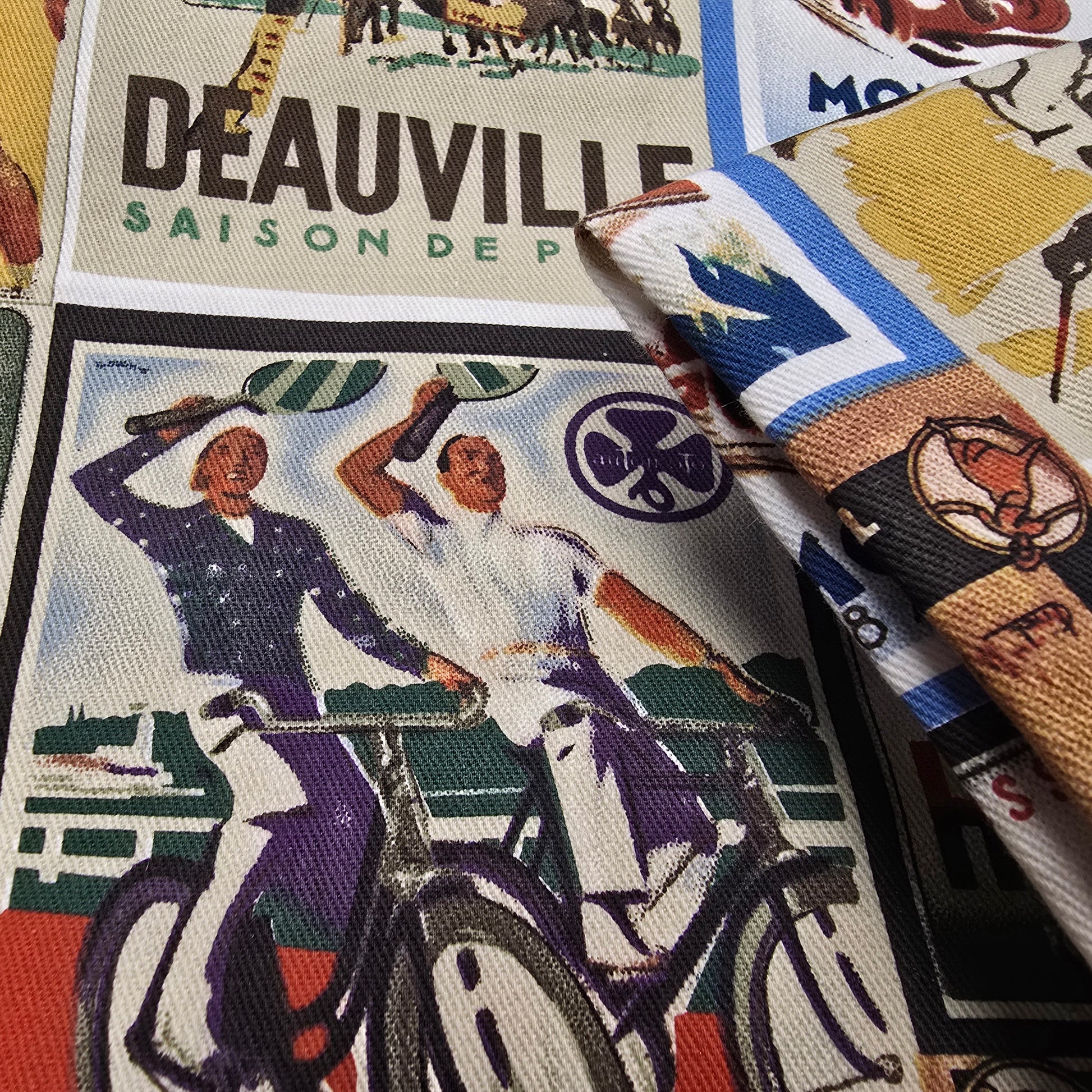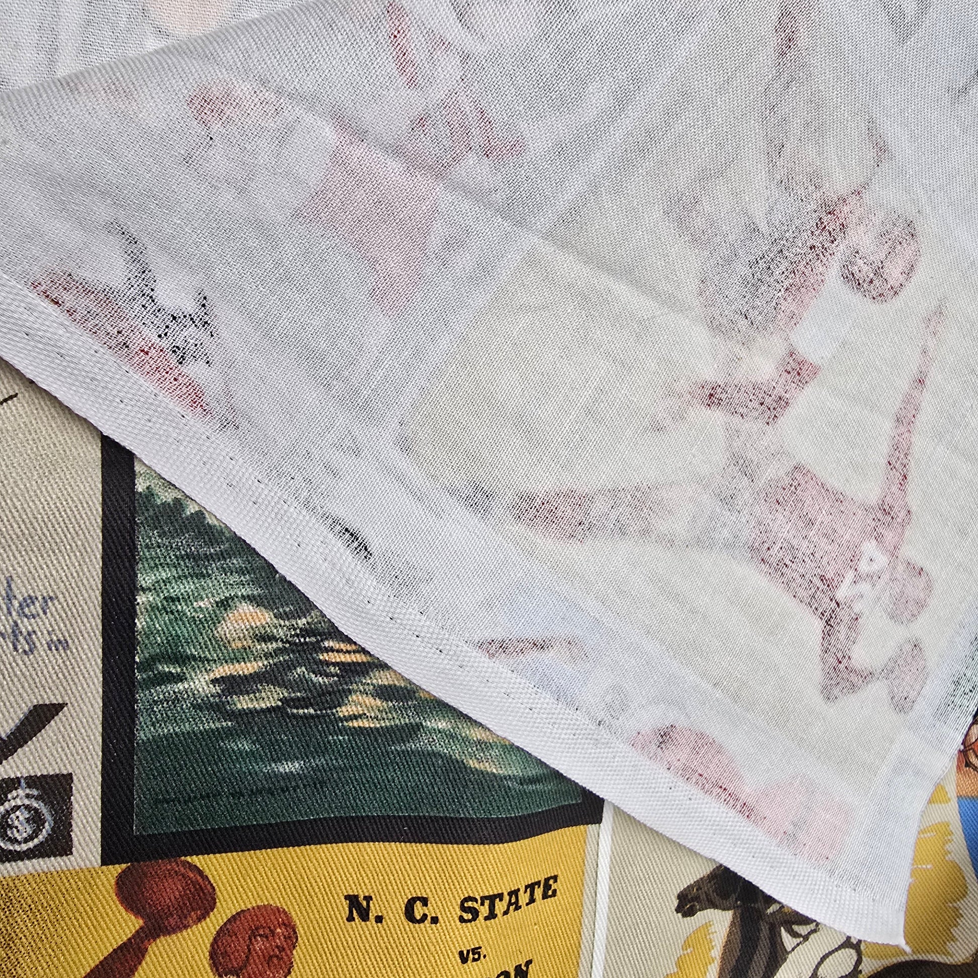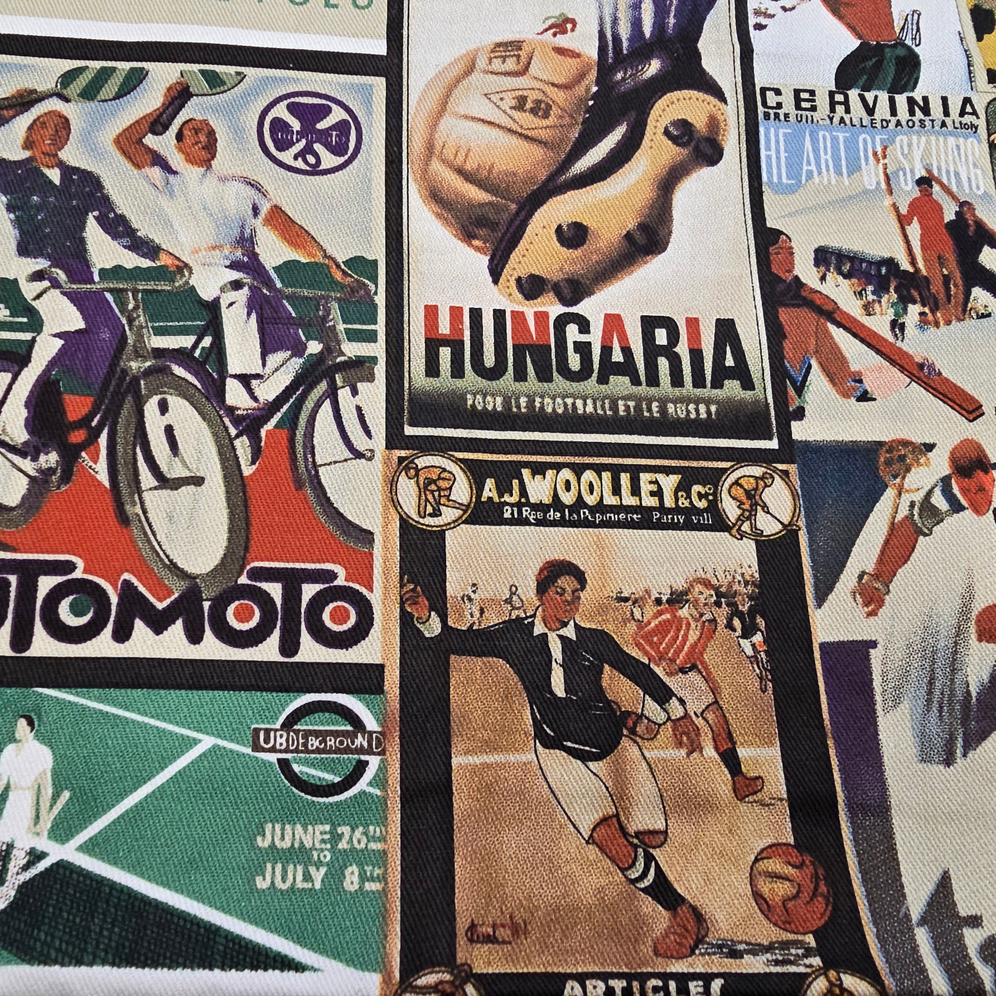 This fabric is a classic cotton drill. known for its durable, diagonal twill weave and substantial weight. The print is a vibrant collage-style montage of vintage sports advertisements and travel posters, likely dating stylistically from the early to mid-20th century (approx. 1920s-1950s).